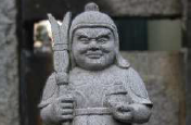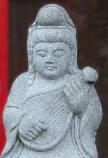 いかつい顔つきの毘沙門天の後は、唯一の女神、弁財天へ。女神がかかえているのは琵琶。「財」の字が使われているところから、弁財天にはお金の香りがします。でも、琵琶の妙なる音色からも連想できるとおり、弁財天は音楽、芸術の神様でもあるのです。母智丘(もちお)神社に祀られています。