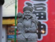 はるばる町田天満宮からはじまった七福神めぐ りの旅もいよいよ最終章。小田急町田駅前カリ ヨン広場に大黒天が祀られています。打ち出の 小槌と大きな袋を持つ大黒天は、じつに福々し い顔をしておられます。その袋の中には、さぞ やぎっしりと財宝がつまっていることでしょう。 米俵に座っているその姿からもわかるとおり、 大黒天の御利益は五穀豊穣です。